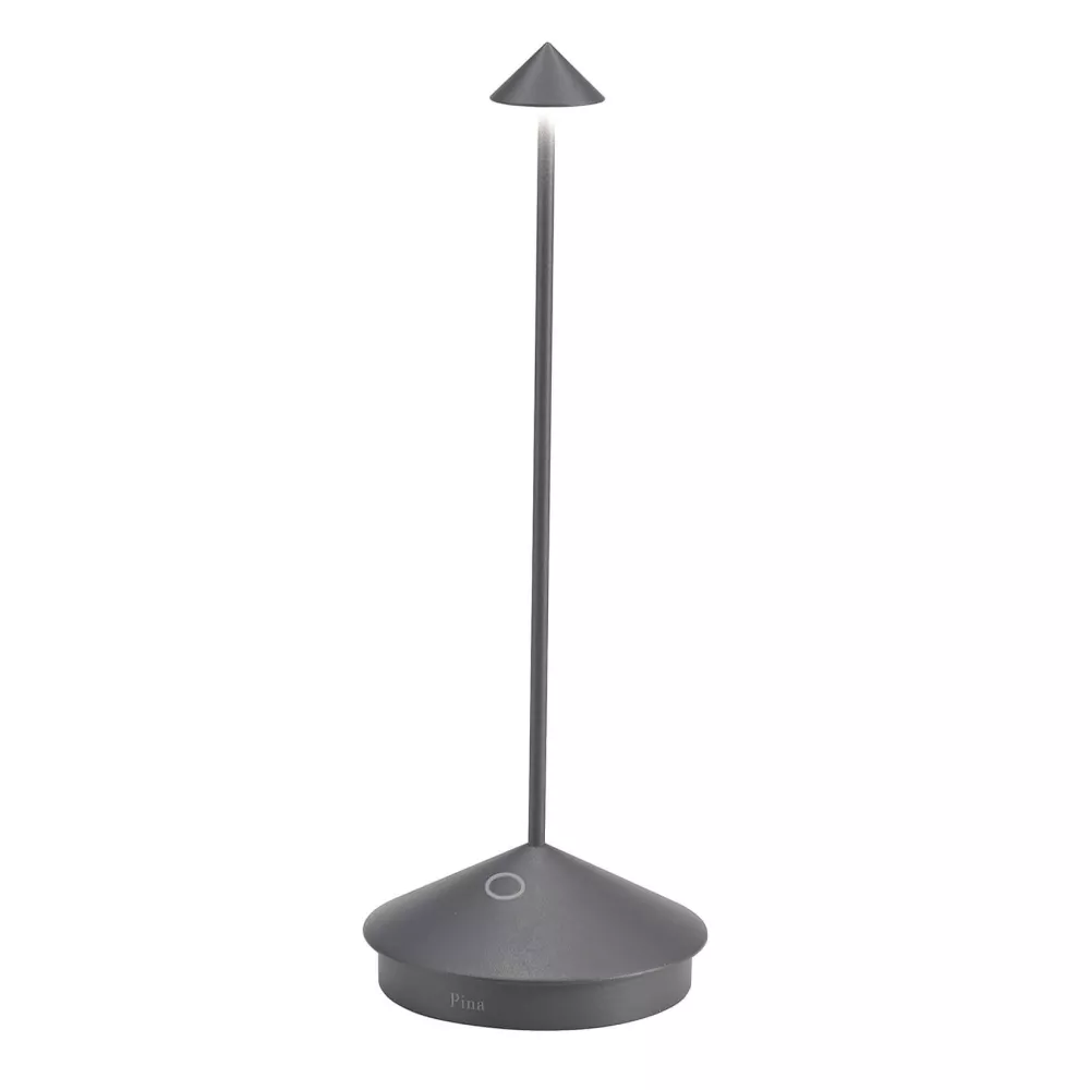 Rechargeable, dimmable table lamp with touch controls, equipped with a contact charging base. Die-cast aluminum body, available in white, corten, and dark gray colors, with a polycarbonate diffuser and LED light source. The rechargeable and dimmable table lamp features touch control and comes with an innovative contact charging base. It has a die-cast aluminum structure, polycarbonate diffuser, and LED light source. The lamp also includes a function to select light color temperature between 2200, 2700, or 3000 Kelvin. With an IP54 rating, the lamp is suitable for both indoor and outdoor use. The lithium battery provides 12 hours of runtime on a single charge. The IP54 protection rating makes the product suitable for both indoor and outdoor use. The lithium battery has a duration of 12 hours. Sku: Pina - LD0650 Ean: 8054144502489 Dimensions: h 29 x d 10.5 cm