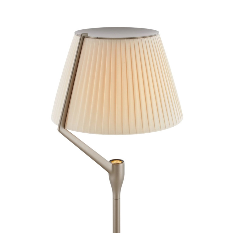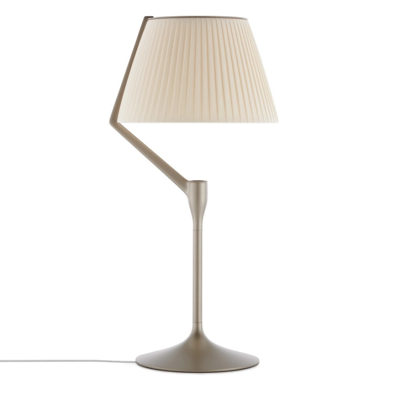 A generously welcomed light, reflected and given to the surrounding environment. The final version of ANGELO STONE, the lamp by Philippe Starck, hits stores, revolutionizing the bulb/lampshade scheme: the light source is not from above but from a LED positioned on the stem that illuminates the shade, creating reflections from highly technological lenses. Thanks to the shade made in a single green polycarbonate mold, the light reflects even more uniformly. ANGELO STONE is available in table and floor versions, in three finishes: champagne, copper, and titanium.