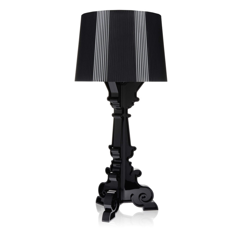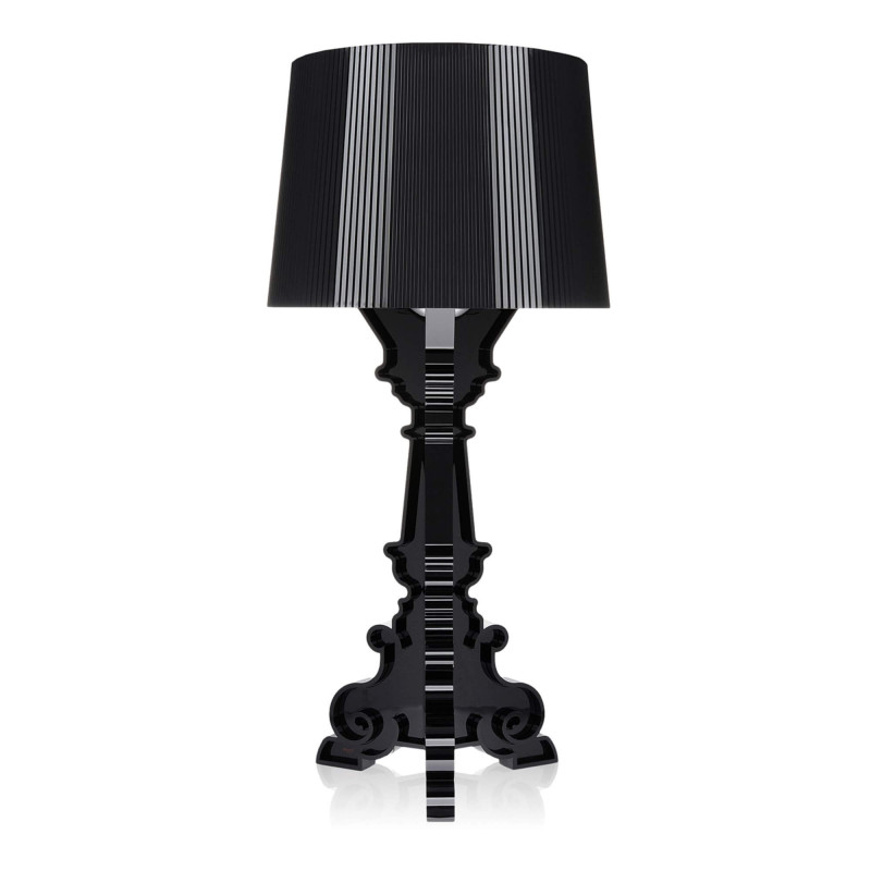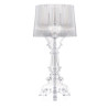 BOURGIE TABLE LAMP, ON/OFF 9071 - KARTELL Bourgie, one of Kartell's best sellers, combines classicism, richness, and tradition with technological innovation. The base, in a baroque style, consists of three decorated levels that intersect, while the wide hat is made with a pleated effect, creating a play of a thousand reflections. With a special hat attachment system, it is possible to achieve three different heights (63, 73, and 78 cm), which can be easily modified according to personal preference. NOT Dimmable model Structure Material: Transparent or mass-colored 2.0 polycarbonate from renewable raw materials Fireproof: Not Fireproof Use: Indoor Dimensions: H 68-78 cm, Ø 37 cm