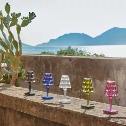 BATTERY TABLE LAMP, 9140 - KARTELL Battery, designed by Ferruccio Laviani, is a renowned table lamp created by Kartell. It is characterized by its compact and iconic lampshade. Crafted from transparent PMMA, Battery exemplifies true innovation as it is 100% rechargeable through a simple plug and can operate independently for up to 8 hours. This portable feature makes it exceptionally easy to move around, making it an ideal choice for outdoor restaurants and cafes. The lampshade of Battery is crystal-colored with a prismatic surface, resulting in captivating light patterns. The lamp's structure showcases a sophisticated blend of three different metallic colors. Materiale Struttura: Tecnopolimero termoplastico Trasparente Dimensioni Larghezza: 13 cm Profondità: 13 cm Altezza: 22 cm Peso unitario: 0.38 kg