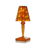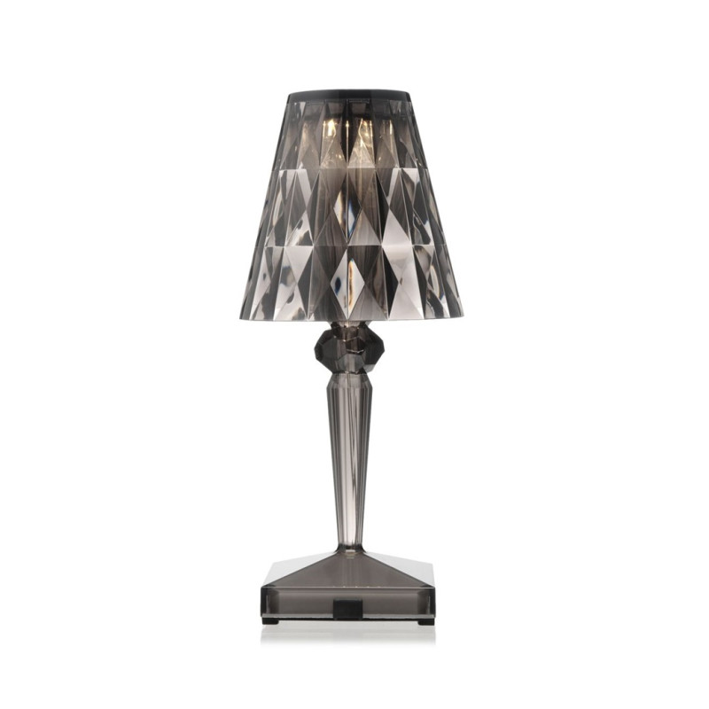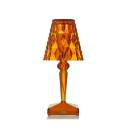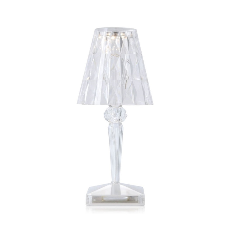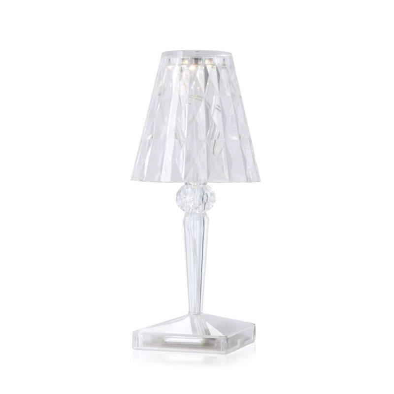 BATTERY TABLE LAMP, 9140 - KARTELL Battery, designed by Ferruccio Laviani, is a renowned table lamp created by Kartell. It is characterized by its compact and iconic lampshade. Crafted from transparent PMMA, Battery exemplifies true innovation as it is 100% rechargeable through a simple plug and can operate independently for up to 8 hours. This portable feature makes it exceptionally easy to move around, making it an ideal choice for outdoor restaurants and cafes. The lampshade of Battery is crystal-colored with a prismatic surface, resulting in captivating light patterns. The lamp's structure showcases a sophisticated blend of three different metallic colors. Materiale Struttura: Tecnopolimero termoplastico Trasparente Dimensioni Larghezza: 13 cm Profondità: 13 cm Altezza: 22 cm Peso unitario: 0.38 kg