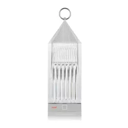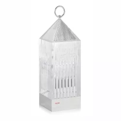 LANTERN TABLE LAMP, 9335 - KARTELL Kartell Lantern table lamp by Fabio Novembre Lantern by Fabio Novembre is an original portable LED lamp, a transparent, injection-molded "rechargeable" lantern that recharges itself on a conductive base. The light is projected thanks to a graphic effect of the design. Material Structure: Transparent Thermoplastic Technopolymer dimensions Width: 9.5 cm Depth: 9.5 cm Height: 31 cm Unit weight: 0.8 kg