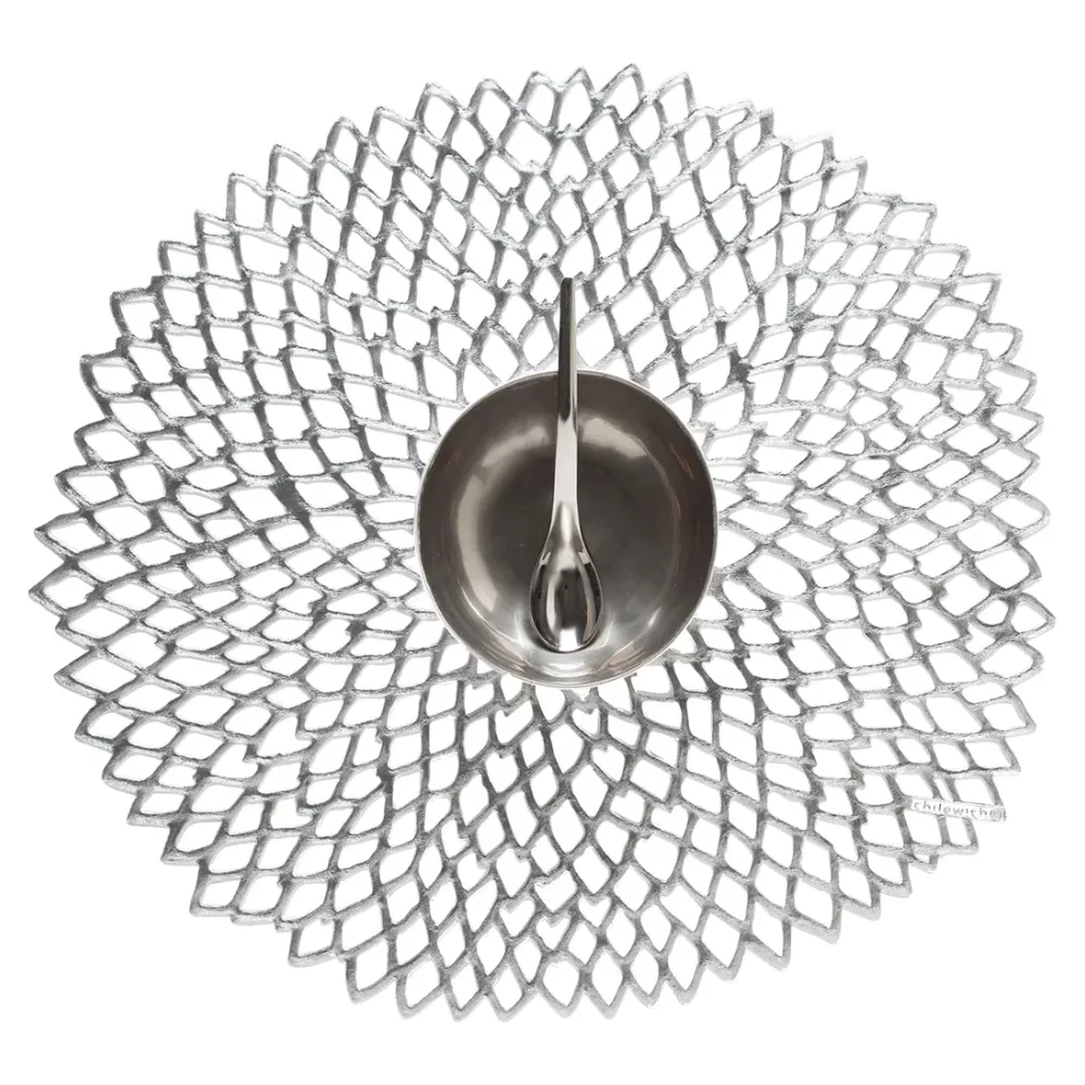 The Dahlia round placemat set by Chilewich is a refined expression of contemporary design and innovative craftsmanship. Featuring an intricate openwork pattern, it recalls the delicacy of lace reinterpreted in a modern way, creating a striking visual effect that enhances every plate. Acting more like a charger than a traditional placemat, it frames each dish with elegance and lightness.