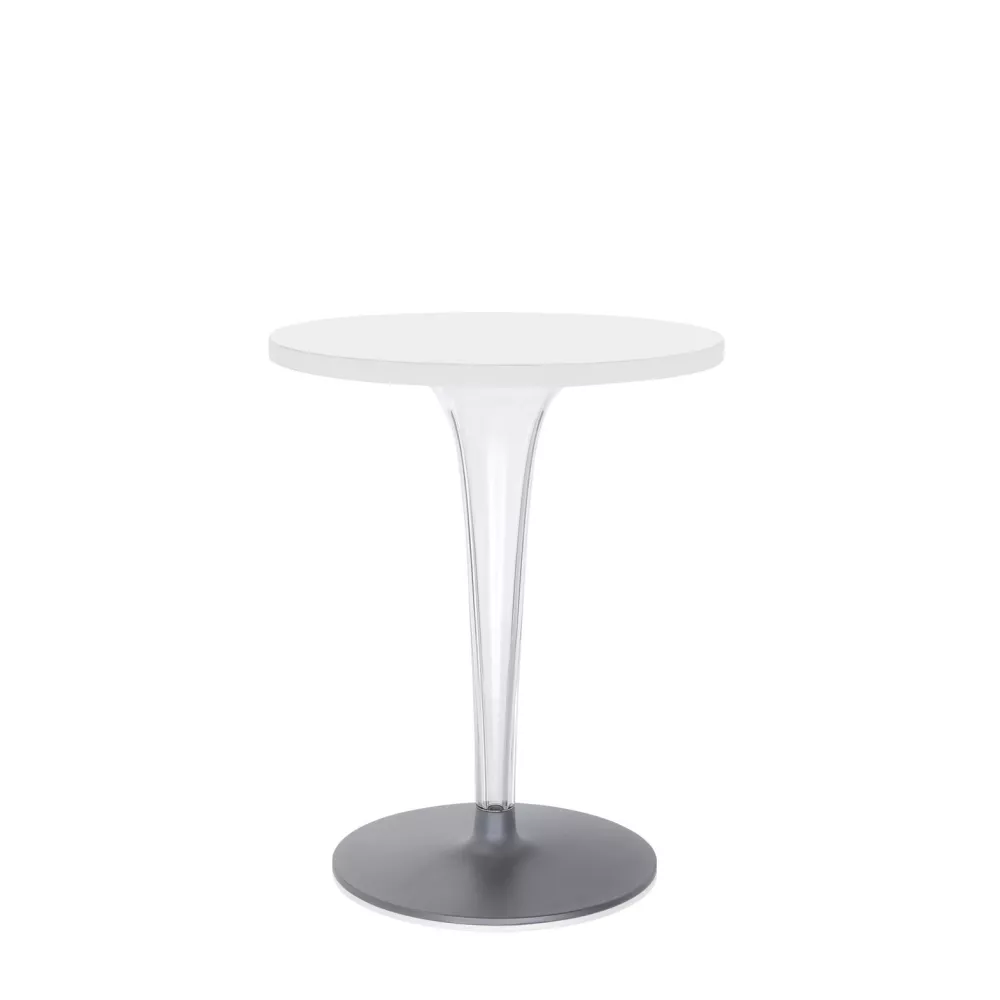 TOP TOP TABLE, 4280 - KARTELL Toptop Table Structure material: Transparent Pmma Top material: Melamine Third Material: Painted Aluminium Fireproof: Not Fireproof Usage: Outdoor Dimensions: H 72 cm, Ø 60 cm This product, given its size and/or value, will have a special shipping cost.