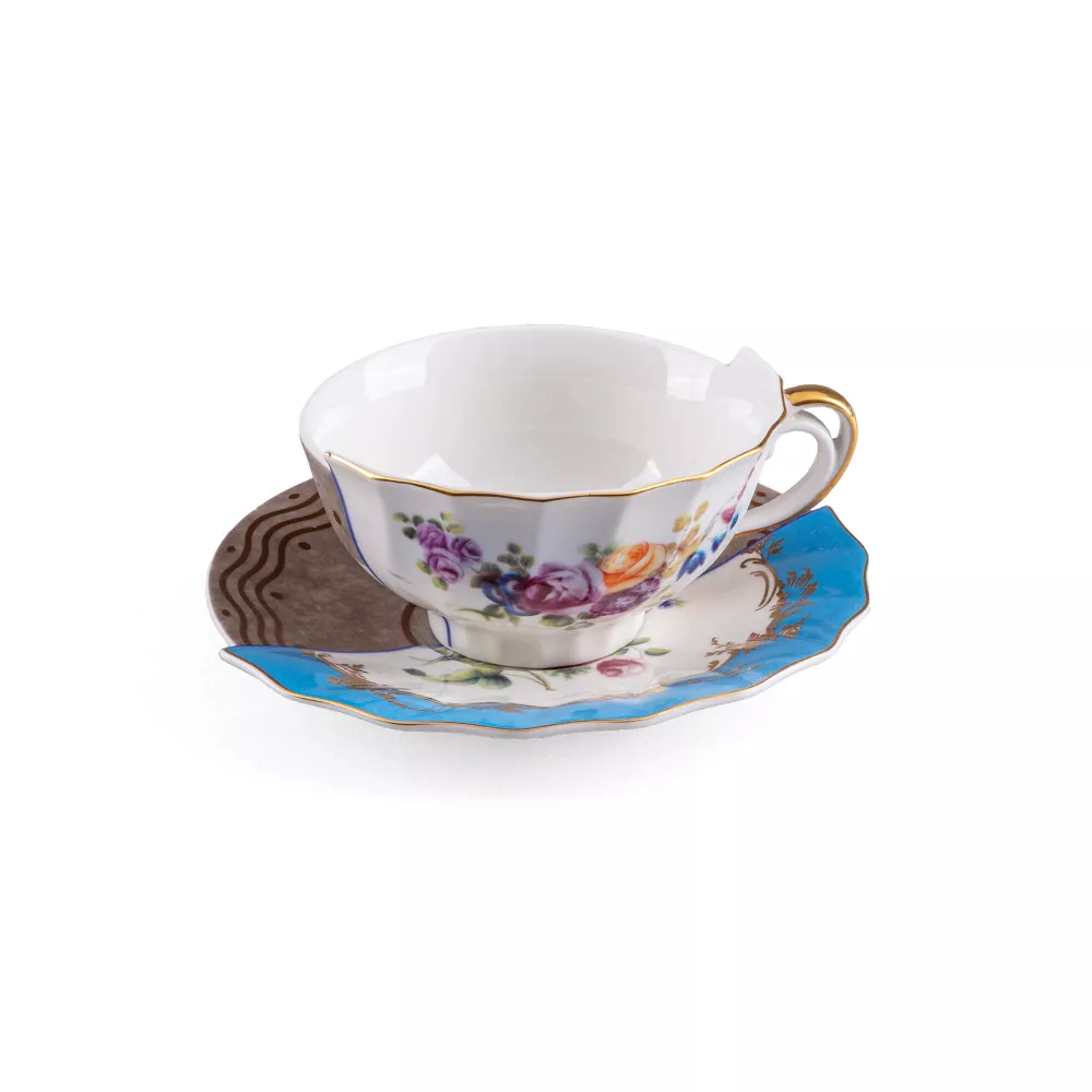 TEA CUP & SAUCER - HYBRID KERMA 9171 When east and west combine. A collection that reflects ancient historic Western and Eastern ceramic production. Hybrid decorations that come from a complex past that evolve into contemporary shapes. Bone China Porcelain Cup Size: d 10,5 x h 5,7 cm Saucer: d 15 x h. 2,5 cm DISCOVER THE COLLECTION: Hybrid by Seletti