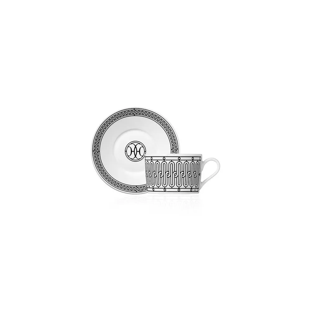 Hermes H Deco Tea cup & saucer The Art Deco wrought-iron friezes which adorn the Hermes 24 Faubourg and rue de Sevres stores, inspired H Deco. This very Parisian service is stamped with the initials HH, around which an intricate black and white decoration spirals. Capacity: 16 cl Code: 37016P For all Hermès products that are not available at the time of purchase, please consider a delivery time of 6 to over 12 months