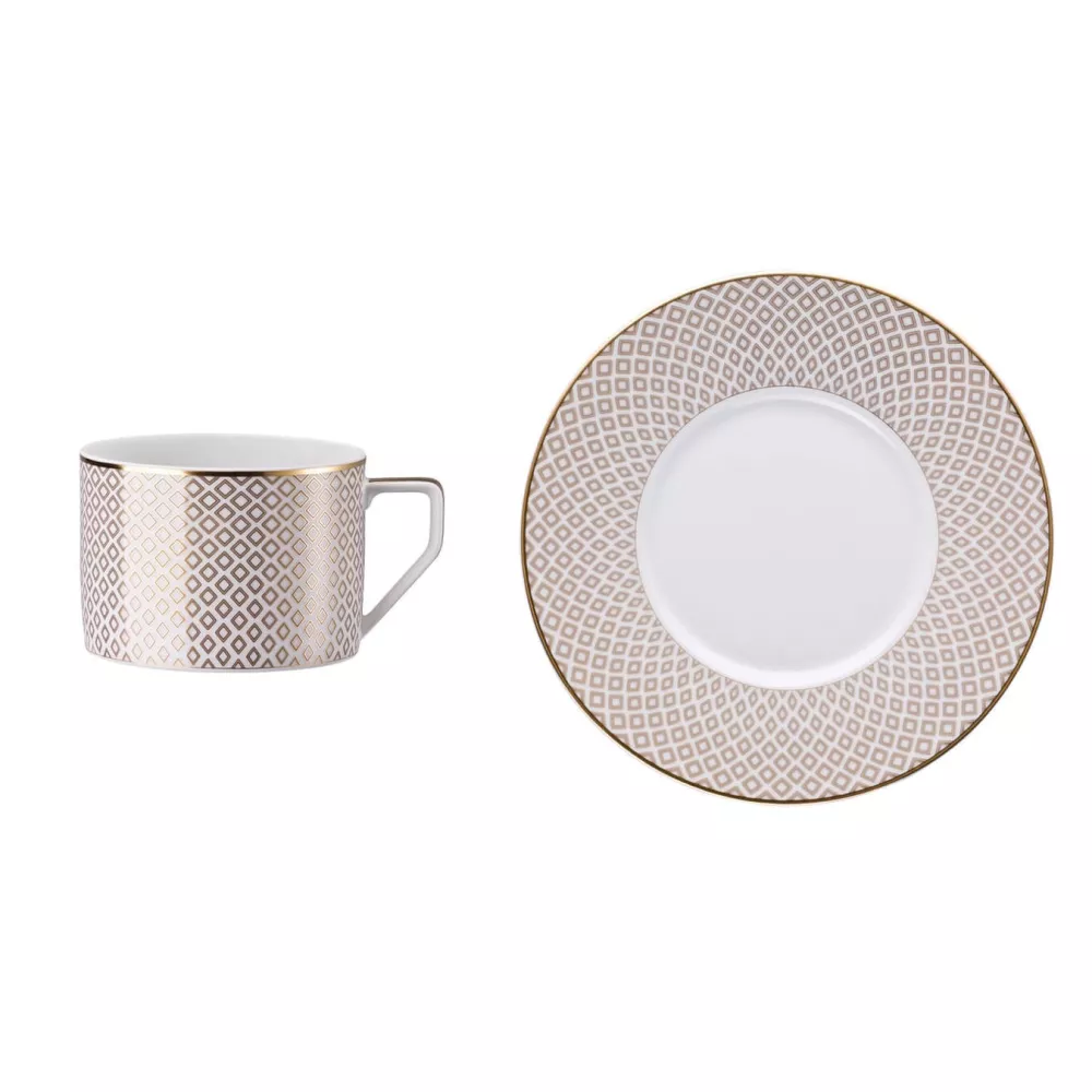 TEA CUP WITH SAUCER, FRANCIS CARREAU BEIGE 10460/404308/14640 - ROSENTHAL Historical references and modern elegance come together in the Carreau decoration on the Francis shape to create a table composition that exudes a classic luxury yet has a light appearance. The interplay of free and solid checkerboard surfaces in royal blue and sensual beige, accented with a subtle golden outline, creates a chromatic effect reminiscent of looking through a kaleidoscope. The sparing use of white surfaces imparts calmness and airiness to the design, while creating an exciting light-dark contrast that beautifully complements the clean lines of the Francis shape. Sku: 10460-404308-14640 Material: Porcelain