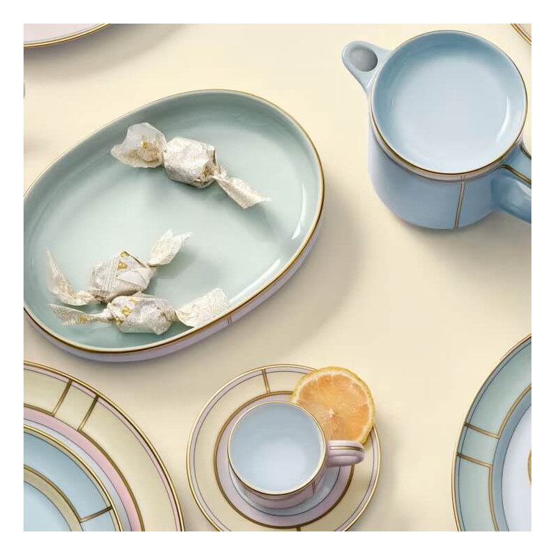 Discover Diva, the collection by Richard Ginori that celebrates Italian design with a contemporary touch, revisiting the iconic style of Giovanni Gariboldi. It features four unexpected decorations in pastel shades—Sky Blue, Yellow, Pink, and Green—enhanced with delicate golden lines that accentuate its minimalist shapes. The versatility and dynamism of this collection are perfectly suited for everyday use, offering innovative and original combinations: the sugar bowl with lid transforms into a small bowl with saucer, while the salad bowl can also function as a soup bowl with the addition of its tray as a lid. The bread plates, perfect for serving small sweets, are the ideal companion for the tea ritual. This collection not only meets daily needs but also adds a touch of luxury and design to your table, available in various table, tea, and coffee configurations and enriched by a dedicated giftware line. Watch the video:Diva by Ginori Technical specifications: Material: Porcelain. Not suitable for the microwave; dishwasher safe on a gentle cycle (max 50°C) Weight: 1092 g Functionality: Stackable product for easy storage
