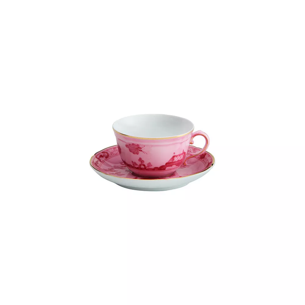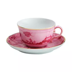 The tea cup with saucer from the Oriente Italiano collection by Richard Ginori evokes an imaginary garden filled with exotic flowers and vibrant colors. The collection blends the elegant Antico Doccia lines with the delicate Carnation motif, inspired by the ceramic tradition of Faenza and reinterpreted with an oriental charm. Hand decorated porcelain brings together Italian heritage and contemporary expression, turning tea time into a refined and decorative ritual. A distinctive piece designed for elegant table settings and also perfect as a gift idea.