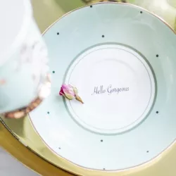 TEA CUP WITH SAUCER, SAFARI CHEETAH A22004014 - YVONNE ELLEN Yvonne Ellen presents her peach-colored tea cup with a Safari theme. Beautifully crafted, it features a cheetah wearing a bow tie and gold accents. Using the Cheetah Safari cup with saucer adds a lovely touch to your tea time. Material: The cup is made of bone china porcelain Size: Ø 14 x H 8 cm Hand wash only.