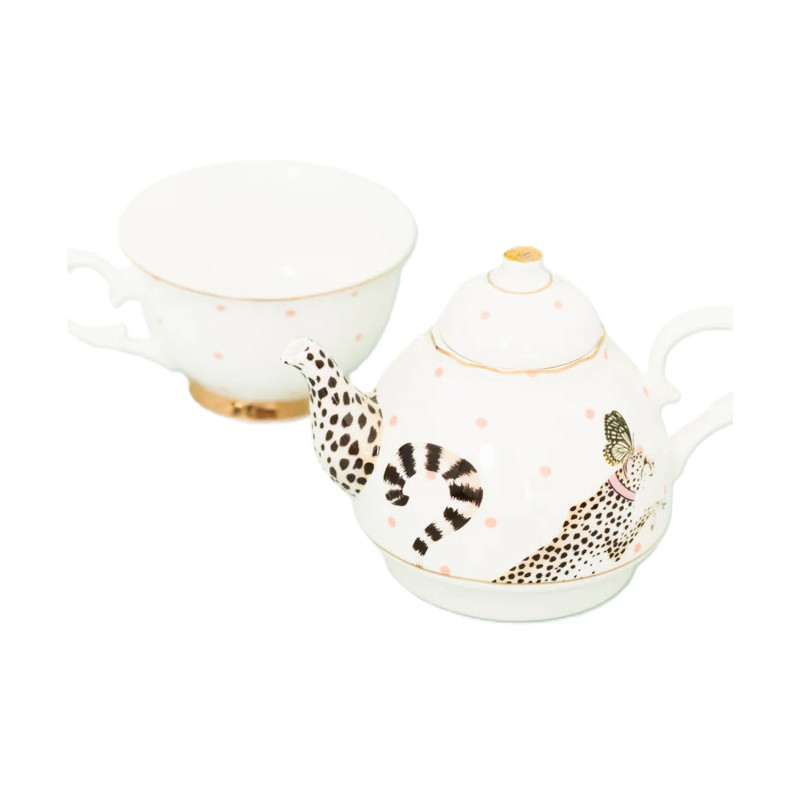 A charming and quirky "Tea for One" set featuring a playful and mischievous cheetah, an animal print spout, and beautiful gilt gold detailing. The cheetah cleverly jumps from the bottom cup to the top teapot section and has a lovely butterfly perched on its head. The Cheeky Cheetah "Tea for One" Set is crafted from the finest bone china and makes enjoying tea for one a true delight. Dimensions - H16 x W16.5 x D12 cm Hand wash only Material - Bone china SKU: 18002 YVONNE ELLEN