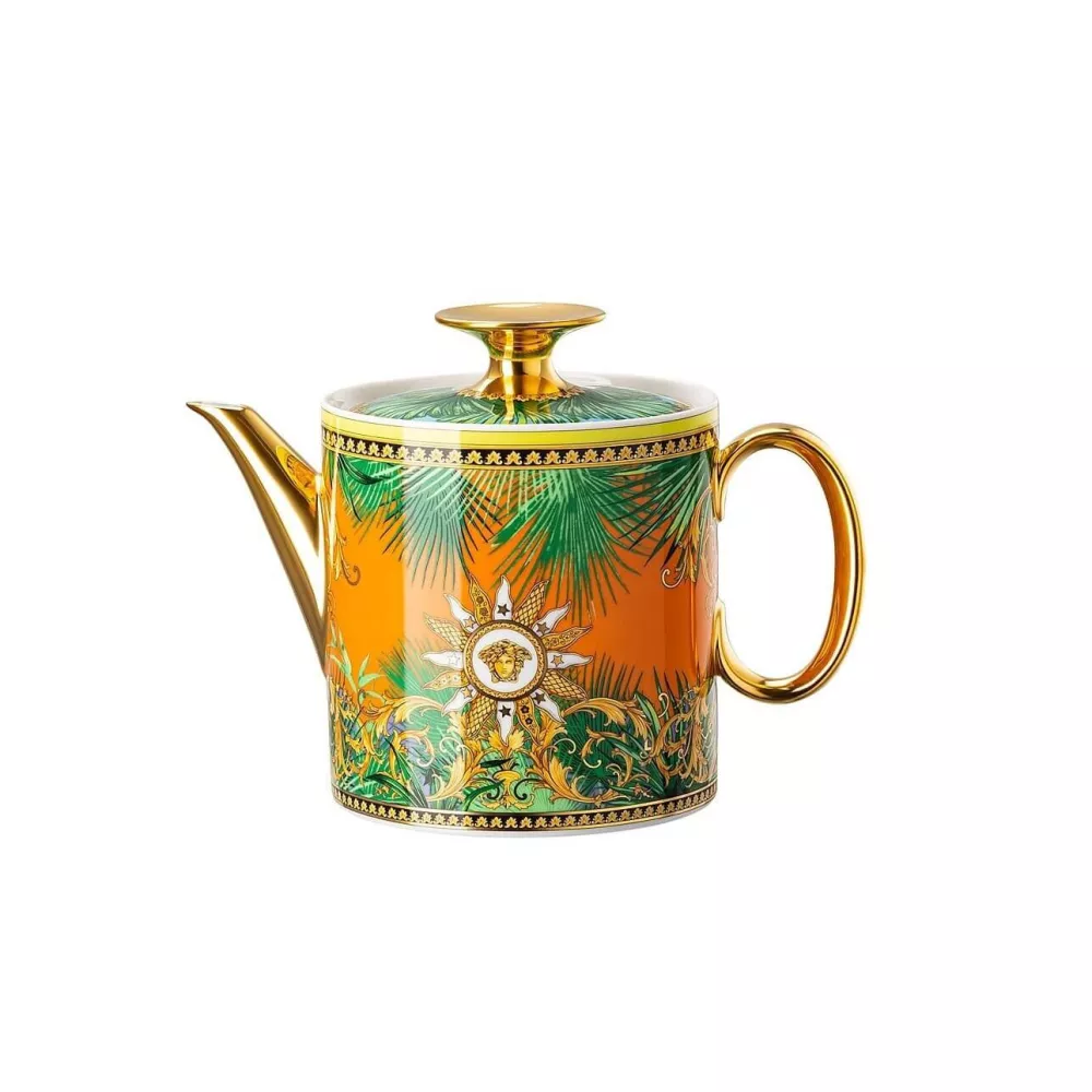 0.90 LT TEAPOT, JUNGLE ANIMALIER 19335-403713-14230 - VERSACE The latest fine porcelain collection fuses the iconic Jungle print with animalier patterns and heritage Medusa accents. The Jungle Animalier line refreshes tableware in a vivid color palette. Crafted in exceptional quality porcelain. SKU: 19335-403713-14230 Material: Porcelain Volume: 0.90 l