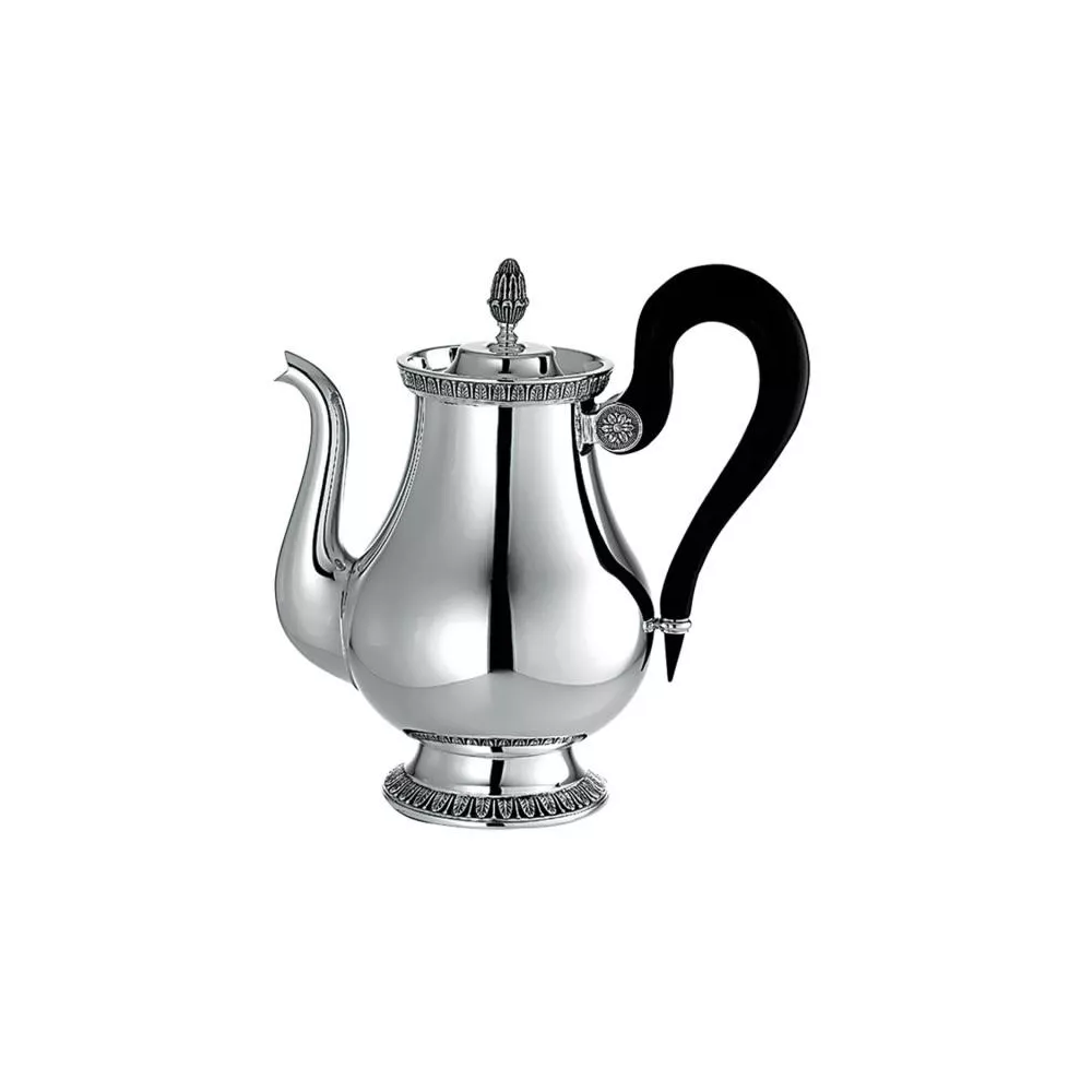 Christofle Malmaison Silver Plated Teapot This silver plated Malmaison teapot, which has a striking ebony wood handle, adds refinement and elegance to any afternoon tea or brunch. Especially when it is paired with the cream pitcher and sugar bowl. One of Christofle's most historic patterns, Malmaison typifies the Empire style, with its frieze of delicate palm and lotus leaves and symmetrical design. The name is a nod to the Chateau de la Malmaison, a favored Parisian residence of Napoleon Bonaparte and Empress Josephine. It is also the only line that includes a caviar service. Malmaison, one of Christofle's most historic patterns, is in the Empire style. The frieze of delicate palm & lotus leaves is typical of this style. MATERIAL • Silver Plated DIMENSIONS • 8 CUPS