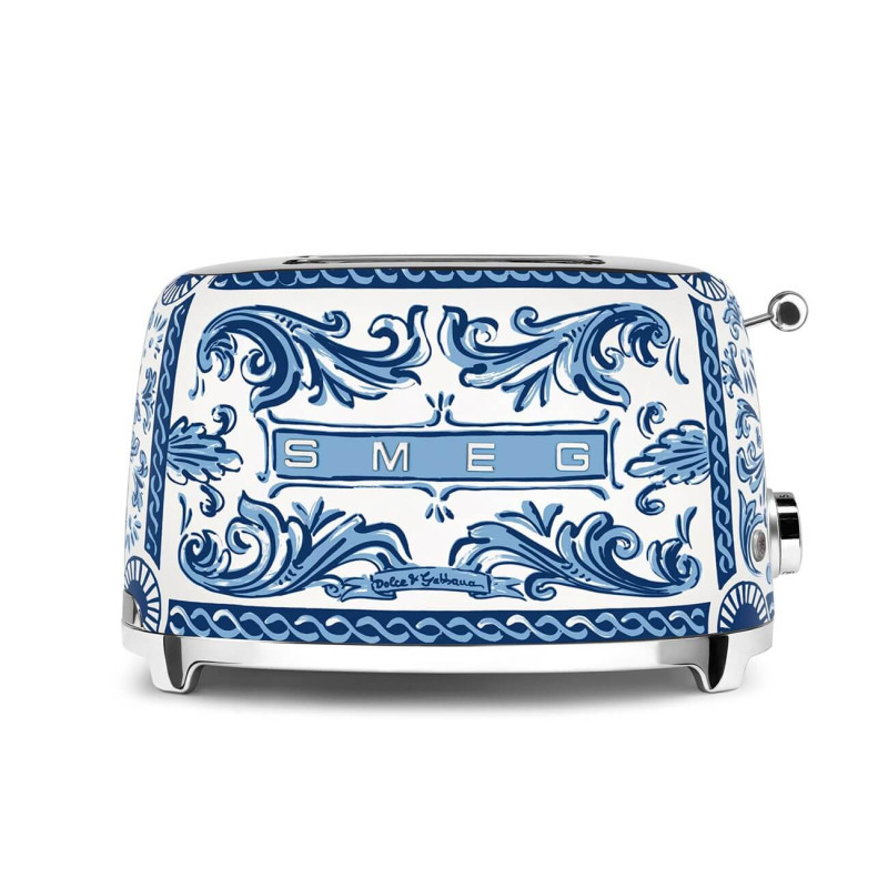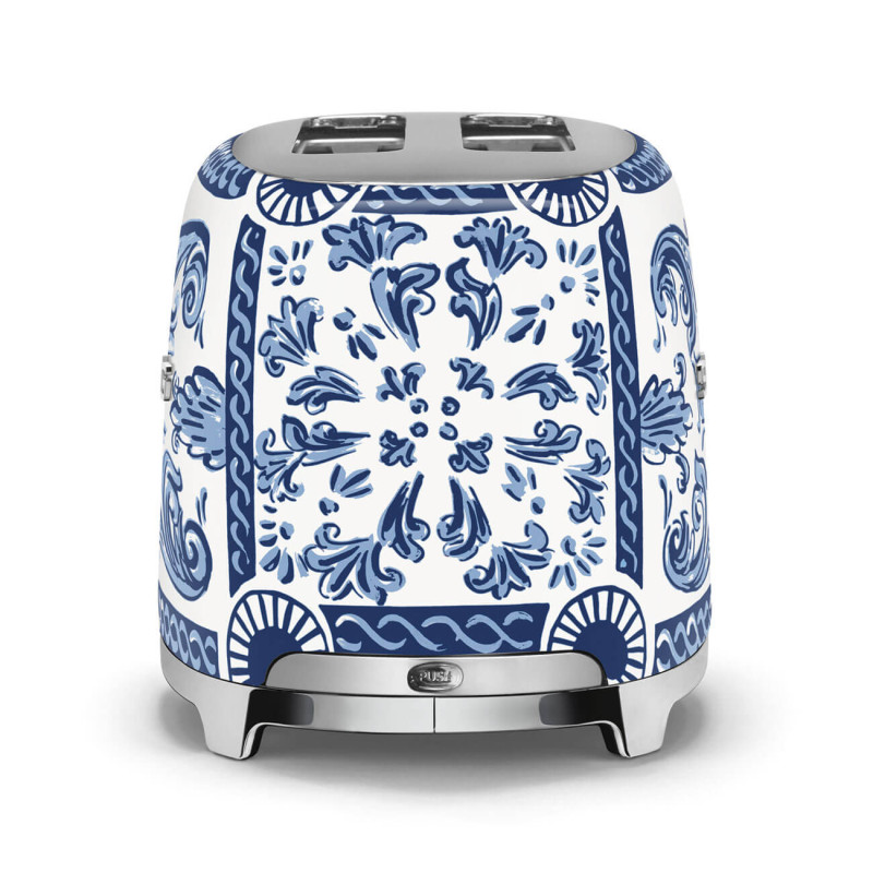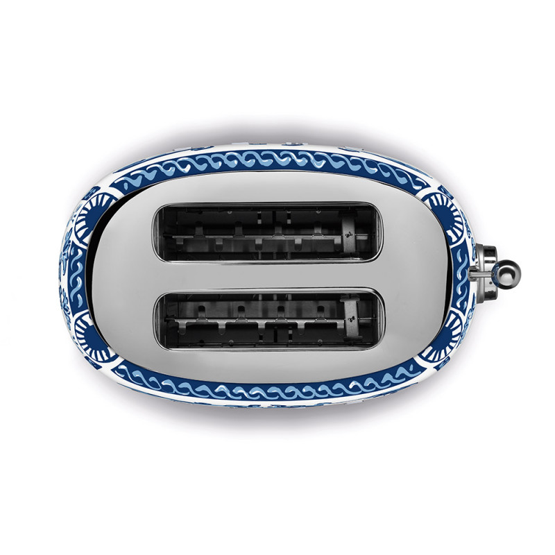 2-SLICE TOASTER D&G MEDITERREAN BLUE, TSF01DGBEU - SMEG Give your kitchen a touch of style with the 2-Slice Smeg Toaster, created in partnership with Dolce & Gabbana. Sicily is the theme of this design, the homeland of the two famous designers. Tongs not included. Chromed steel body Matte chrome plastic base/top Stainless steel activation lever knob Backlit chrome control knob Technical features: No. 2 large slots (36mm - each) Automatic slice centering Automatic ejection at the end of the cycle Removable stainless steel crumb tray Integrated cable storage compartment Non-slip feet Functions: 6 browning levels 3 preset programs: reheat, defrost, bagel General specifications: Dimensions HxLxW 198 x 310 (325 with activation lever) x 195 mm Net weight 2.450 Kg Cable length 1 m Electrical specifications: Power 950 W Voltage 220-240 V Frequency 50/60 Hz Smeg Code: TSF01DGBEU