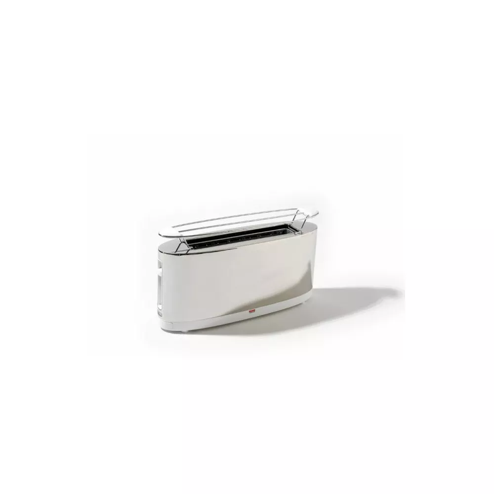 Kitchen electric appliances get the minimalist, modernist and elegant approach started by Stefano Giovannoni with his other electric appliance designs for Alessi. Toaster with bun warmer in 18/10 stainless steel mirror polished and PC, white. English plug. Height (cm): 19.00 Length (cm): 41.00 Width (cm): 11.50