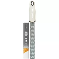The iconic Premium Classic Zester from Microplane has revolutionized the kitchen with its long, narrow design and ultra-sharp photo-etched stainless steel blades – made in the USA. With 400 precision teeth, it effortlessly grates citrus zest, hard cheeses, chocolate, spices, truffles, nuts, and more.