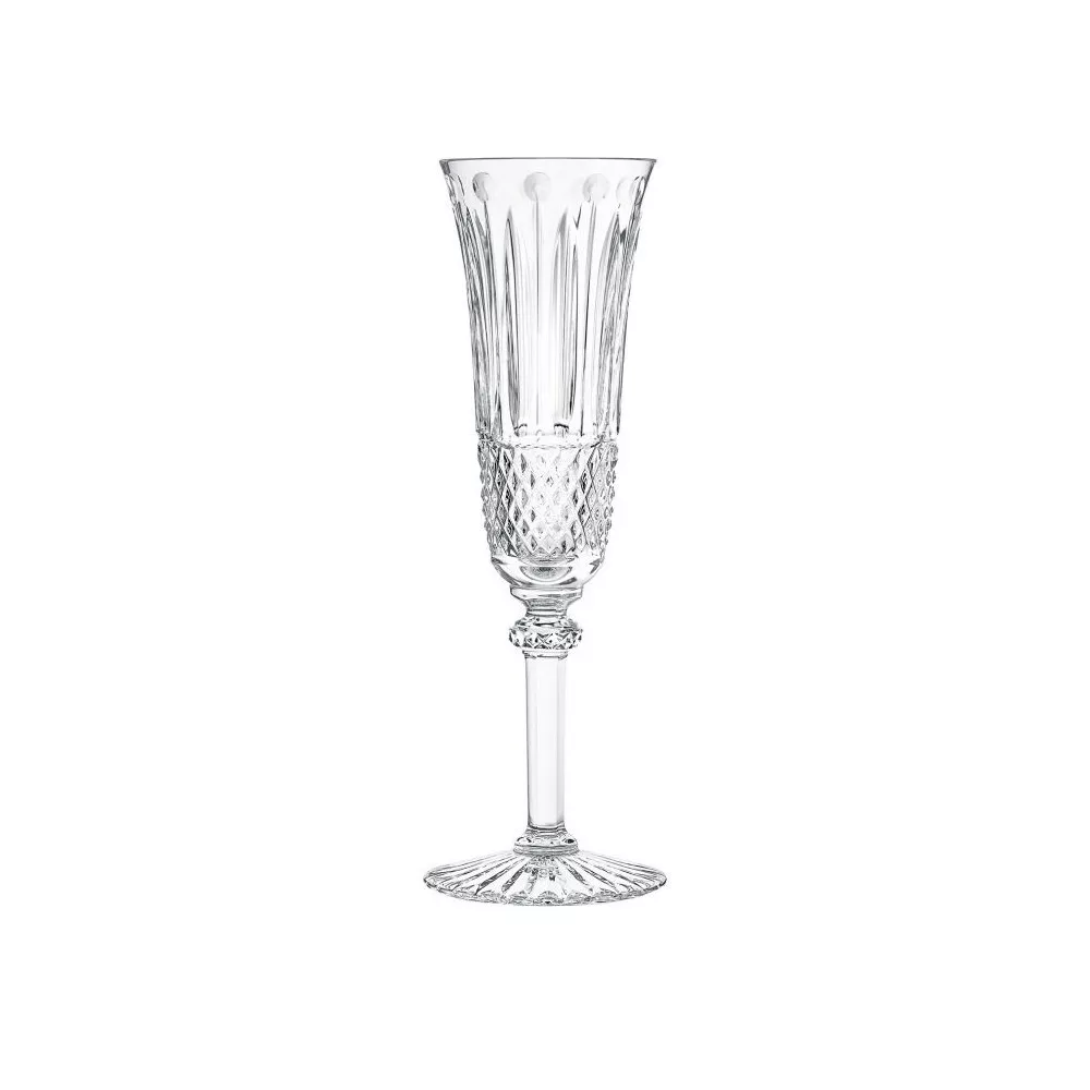 The Tommy collection, a classic of the Saint-Louis production since 1928, is striking for its elegance and richness. For its realization, the maison uses three different cutting techniques: faceted, ball and diamond. The fine workmanship of the crystal gives splendor to the table, making it appreciate its magic. Tommy Champagne Flute Goblet Dimensions: Height 205 mm, Diameter 58 mm, Volume 11 cl Material: crystal glass Product code: 12408000.