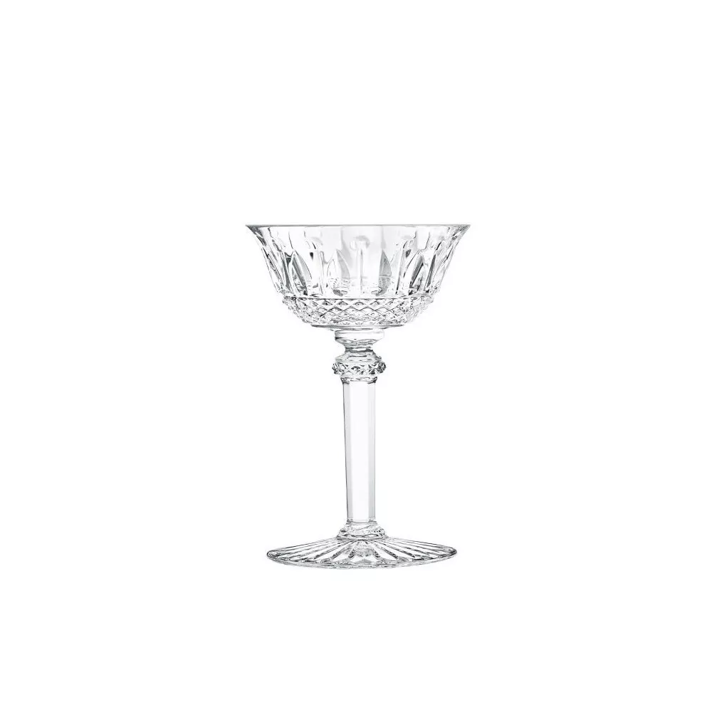 The Tommy collection, a classic of the Saint-Louis production since 1928, is striking for its elegance and richness. For its realization, the maison uses three different cutting techniques: faceted, ball and diamond. The fine workmanship of the crystal gives splendor to the table, making it appreciate its magic. Tommy Champagne Coupe Dimensions: Height 146 mm, Diameter 100 mm, Volume 16 cl Material: crystal glass Product code: 12408400