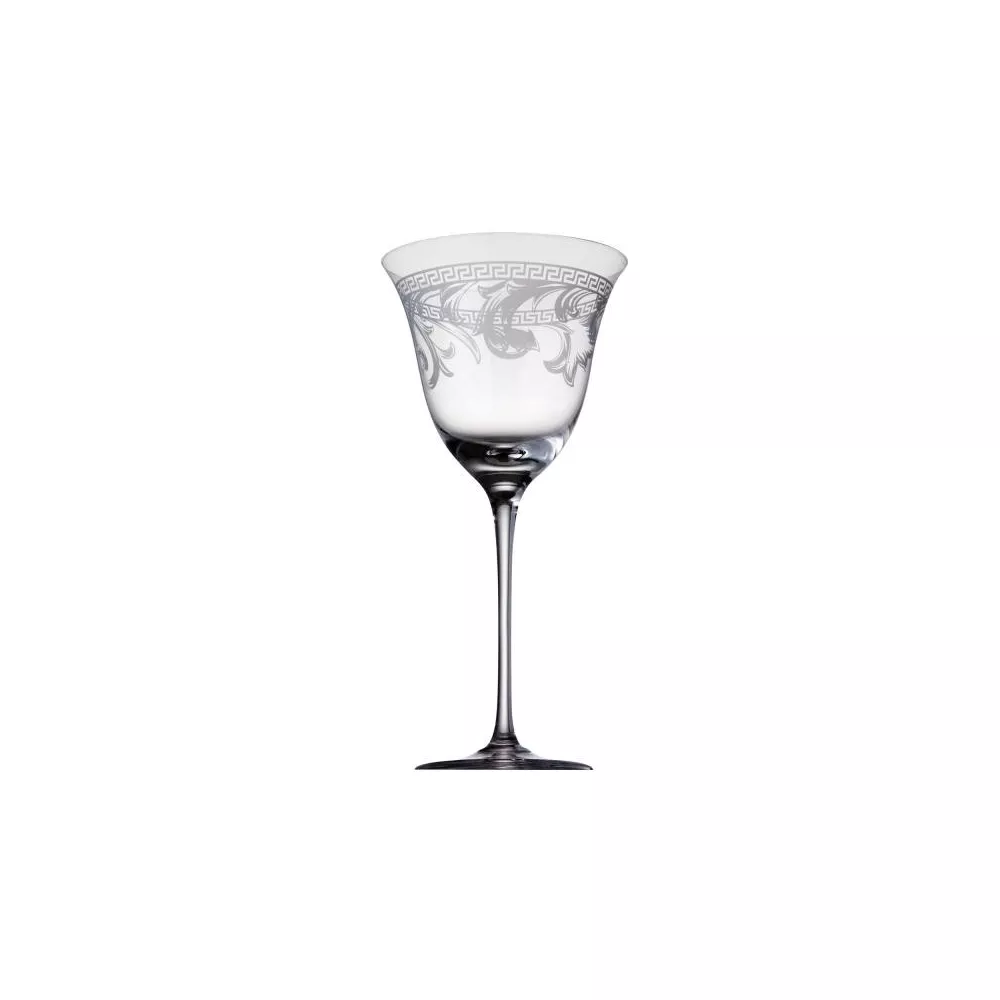 Clear glass made goblet with arabesque friezes enrichment. Created by Donatella Versace, measure in height 22.4 cm and has a capacity of lt. 0.400. Hand washing is recommended. .
