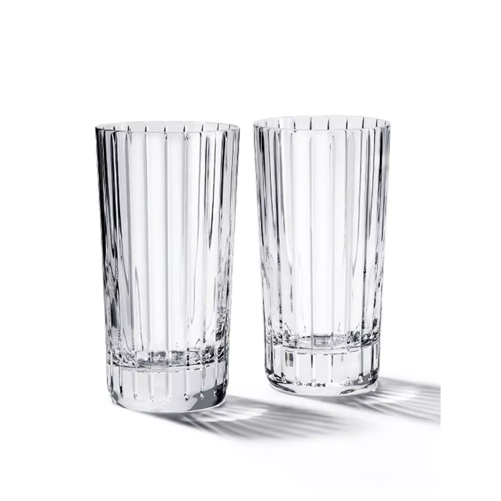 SET OF 2 TALL GLASS HARMONIE, 2810595 - BACCARAT Successive parallel cuts spread cleanly along the transparent crystal, gently touching the glass from the rim down to the thick base. This glass has an artistic appearance due to the emphasized vertical lines, while the reliefs on the surface give it a solid structure. Every time you sip a liquor or cocktail, this glass deserves to be admired for its beauty. The vertical lines are also present in other pieces of the Harmonie collection, which includes tumbler glasses and a round whiskey bottle. SKU 2810595 Height: 14 cm Capacity: 34 cl.