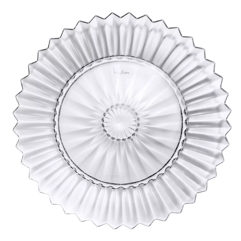 The Mille Nuits L crystal plate by Baccarat embodies artisanal refinement and timeless elegance. Its delicately rippled edges, inspired by brisee pastry, form a luminous frame that enhances every presentation and showcases Baccarat craftsmanship. Designed by Mathias and made in France, this plate is an iconic piece of the Mille Nuits collection, perfect for elevating the table with a dramatic and sophisticated style.