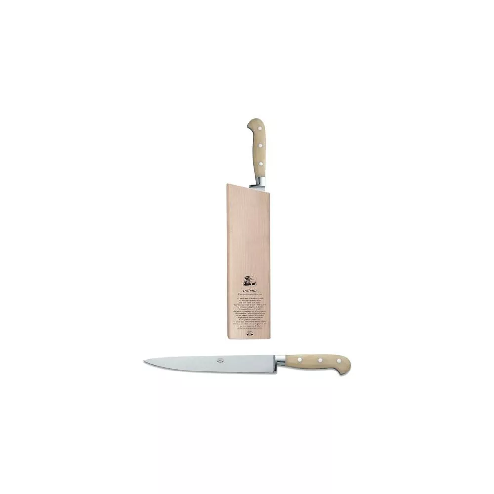 The Berti fish knife with a white handle is ideal for slicing and filleting fish with precision. Its thin, sharp blade ensures delicate and accurate cuts, while the white handle provides a comfortable and stylish grip. The included block allows for safe storage, preserving the blade's sharpness and quality. An essential tool for those who appreciate fine dining and cooking.