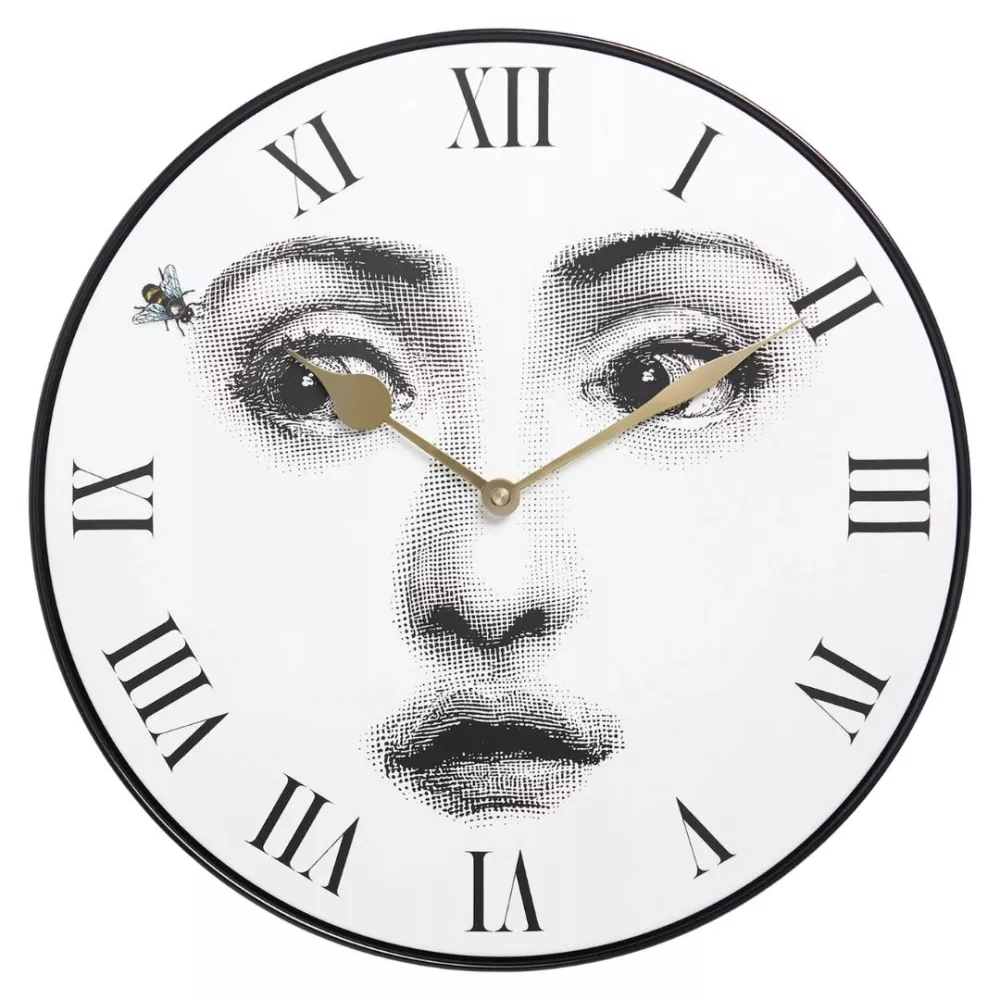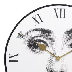 The unmistakable face of the Tema e Variazioni series takes on a playful twist in this wall clock, surprised by the presence of a small bee. A design that blends elegance with whimsical irony, perfectly embodying Fornasetti’s artistic language. The sturdy metal case is hand-decorated by the Milanese Atelier, while the hands move with a silent and continuous motion. Each clock is a unique piece, a testament to the artisanal mastery of the maison.