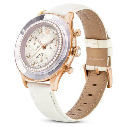 The round 37mm case is made with a rose gold-tone finish and features a crystallized bezel, which is neatly faceted and accompanied by a circle of clear pavé. Beneath the mineral glass, the guilloché dial features a swan logo at 12 o’clock, LumiNova coated hands, and three chronograph counters for separate measurements of hours, minutes, and seconds. There are also six clear crystals used for the indexes and a single crystal placed in the watch’s crown. This Swiss made watch is water resistant to 50m and is worn on a quick-release Italian calfskin leather strap with an embossed crocodile pattern. Collection: Octea Chrono Case size: 42.6/43 mm x 37 mm Watch strap length: 16 cm Material: Crystals, Rose gold-tone PVD Strap material: Italian calf-skin leather Made in: Switzerland Mechanism: Quartz