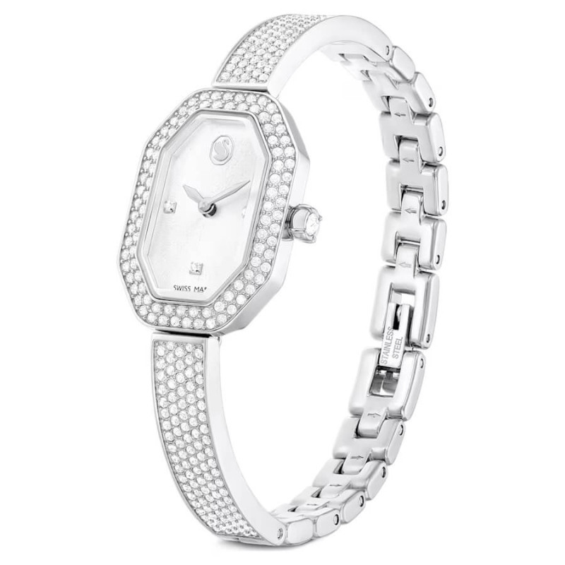 A timepiece that captures the rays of light and transforms them into pure elegance. The Dextera bangle, crafted in Swarovski’s iconic octagonal shape, features a Swiss Made 31 x 19 mm case framed by a pavé of 92 crystals. The radiant sunray dial displays three crystal-set hour markers and the swan emblem at 12 o’clock, while a single crystal adorns the crown. The adjustable bracelet is elevated by a gradient of 197 crystals, ensuring extraordinary brilliance at every hour. Water-resistant up to 50 m, this watch combines joyful extravagance with Swarovski’s signature savoir-faire.