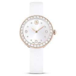 A symbol of refined elegance, the Matrix Tennis Watch by Swarovski reflects the iconic design of the Matrix Tennis collection. The 30 mm stainless steel case with rose gold-tone PVD finish is adorned with a pavé of 30 Cry crystals on the bezel. The sunray-patterned dial features crystal hour markers and the swan logo at 12 o'clock, adding a touch of sophistication. The Italian calfskin leather strap, with a satin finish and quick-release system, ensures comfort and practicality. Water-resistant up to 50 meters, this Swiss Made timepiece is completed with a single crystal set into the crown, making it the perfect accessory to pair with other pieces from the Matrix Tennis collection.