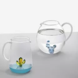 BLUE CACTUS PITCHER, DESERT PLANTS, 09352110 - ICHENDORF MILANO The pitcher, equipped with a milky white handle, features a blue cactus inside the glass, adding a naturalistic detail that is both original and light and elegant. This object is perfect both as a functional element on a dining table and as a decoration for the home. The Desert Plants collection includes a variety of elements that evoke nature, with colorful cacti creating an imaginary landscape atmosphere on the table. The master glassblowers handcrafted the pitcher using perfectly transparent blown glass. Dimensions: H 19 x ø 16 cm Capacity: 2,90 lt Design by: Alessandra Baldereschi Handcrafted borosilicate glass blown by lampworking Dishwasher safe at low temperatures (recommended 40°).