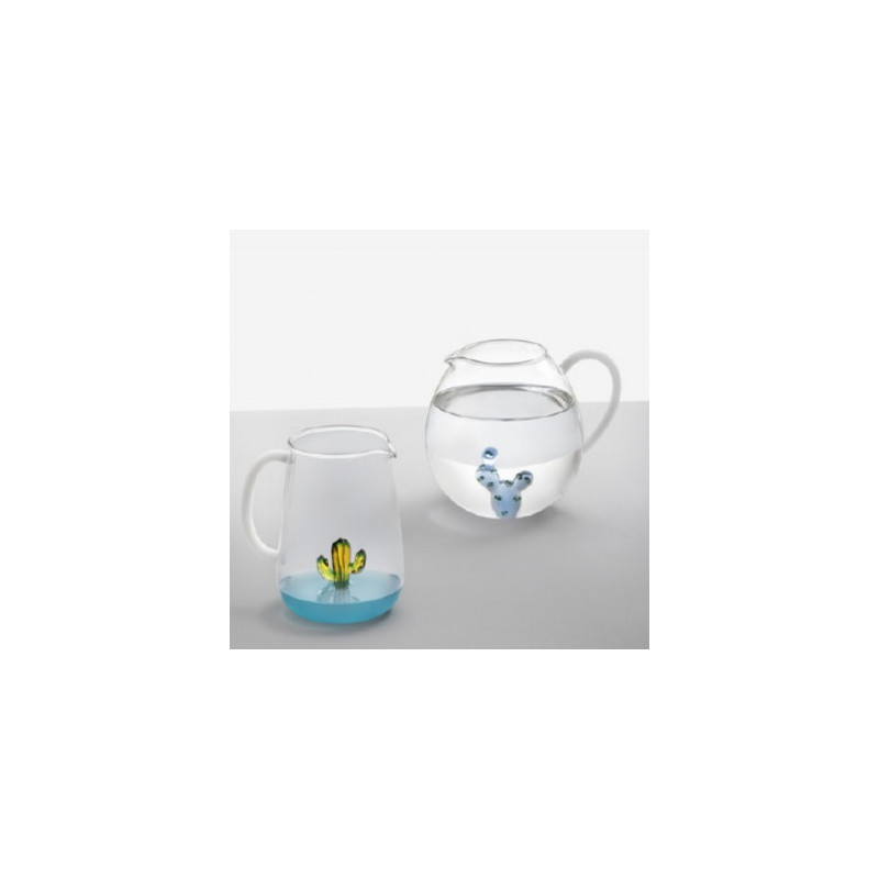 GREEN CACTUS PITCHER, DESERT PLANTS, 09352099 - ICHENDORF MILANO The pitcher, equipped with a milky white handle, features a green cactus inside the glass, adding a naturalistic detail that is both original and light and elegant. This object is perfect both as a functional element on a dining table and as a decoration for the home. The Desert Plants collection includes a variety of elements that evoke nature, with colorful cacti creating an imaginary landscape atmosphere on the table. The master glassblowers handcrafted the pitcher using perfectly transparent blown glass. Dimensions: H. 18.5 - L. 10 L. 16,0 cm Capacity: 1.75 liters Design by: Alessandra Baldereschi Handcrafted borosilicate glass blown by lampworking Dishwasher safe at low temperatures (recommended 40°).