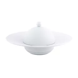 The Hemisphere Glossy White Cloche by Coquet is the perfect accessory for your rim soup plate, ideal for extraordinary presentations as seen in the finest restaurants. Crafted from Limoges porcelain and fired at 1400°C, this 12.5 cm cloche offers exceptional resistance to high temperatures, blending functionality with refined elegance. Dishwasher-safe and microwave-friendly (except for models with precious metal decorations), it is an essential addition to elevate your table setting. Avoid sudden temperature changes to maintain its quality.