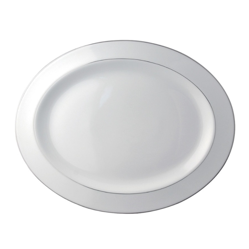 OVAL TRAY 38 CM, CRISTAL 0758 / 107 - BERNARDAUD This line of plates is characterized by a modern and refined design, with a slender silhouette and clean lines that perfectly adapt to any type of decor. The porcelain used for the production of the plates is of the highest quality, worked with care and attention to detail to ensure maximum resistance and durability. The range of products in the "Cristal" line includes dinner plates, soup plates, dessert plates, tea and coffee saucers, and much more, each characterized by a timeless beauty and impeccable craftsmanship. Cristal by Bernardaud is synonymous with elegance, refinement, and artisanal quality, with a modern and versatile design suitable for any occasion. Material: Porcelain SKU: 0758107 Dimensions: 38 cm