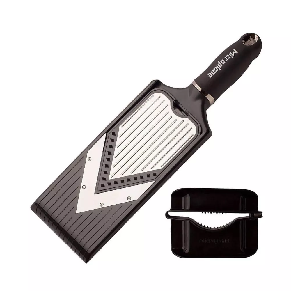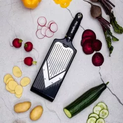 With the new adjustable V-shaped mandoline, you can quickly, precisely, and effortlessly slice fruits, vegetables, and cheeses. In addition to cutting food into slices, thanks to the julienne insert, you can create long, thin strips of the desired thickness.
