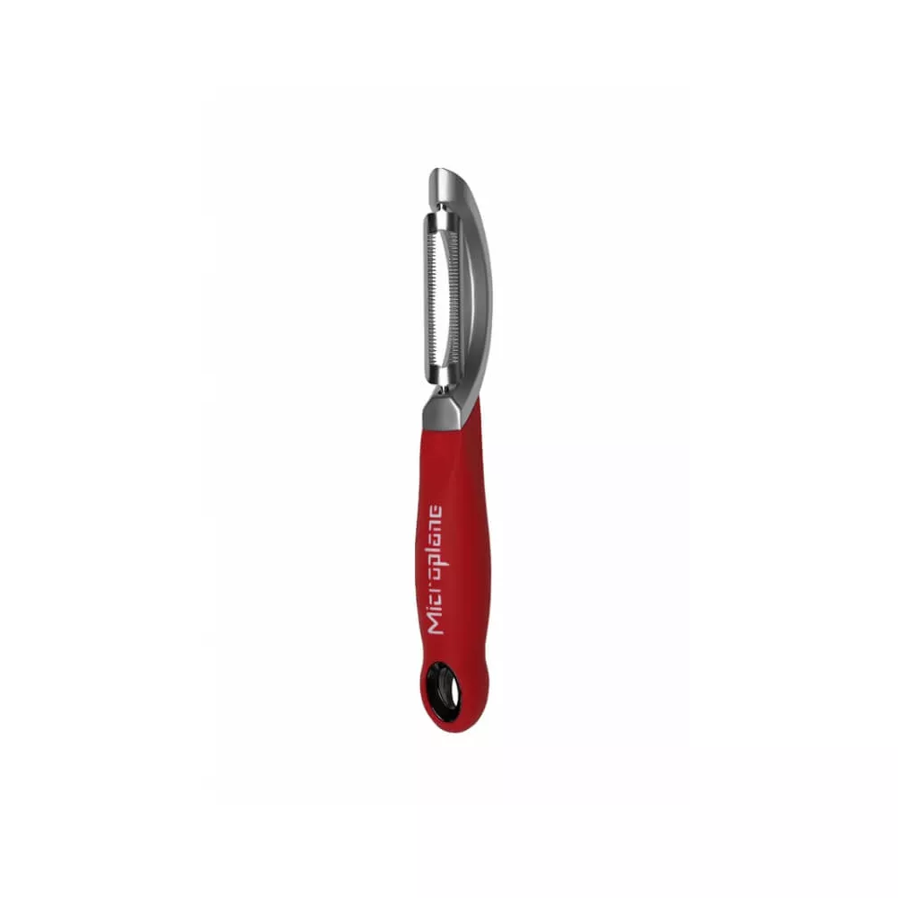 SERRATED VEGETABLE PEELER, 48192 - MICROPLANE The Microplane serrated blade vegetable peeler simplifies the peeling of fruits and vegetables. The double-bladed design with teeth allows it to adapt to the shape of the food, removing only what is necessary. It is suitable for peeling tomatoes, peaches, kiwis, bell peppers, and other foods. It does not require pre-blanching and cuts the skin precisely. The ergonomic soft-touch handle is comfortable for both left-handed and right-handed individuals. The tip is specifically designed for removing eyes and sprouts. The vegetable peeler is easy to clean, simply rinse it under running water or wash it in the dishwasher. Features: Ergonomic soft-touch handle Suitable for both left-handed and right-handed individuals Easy to clean. Rinse under running water / dishwasher safe Dimensions: L 18.5 cm / W 2.5 cm / H 2.5 cm