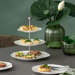 L’Alzata Pura 10-4466-7880 di Villeroy and Boch valorizza la presentazione con un’eleganza pura e scenografica. Realizzata in porcellana premium, si distingue per la texture setosa e il bianco assoluto che esalta ogni creazione come su una tela, dalla pasticceria raffinata a finger food gourmet. Le linee fluide richiamano la leggerezza di una foglia di loto che scivola sull’acqua, creando una silhouette armoniosa e naturale. Con il suo diametro di 27 cm, dona verticalità e raffinatezza alla tavola, diventando anche una idea regalo elegante per chi ama il design contemporaneo.