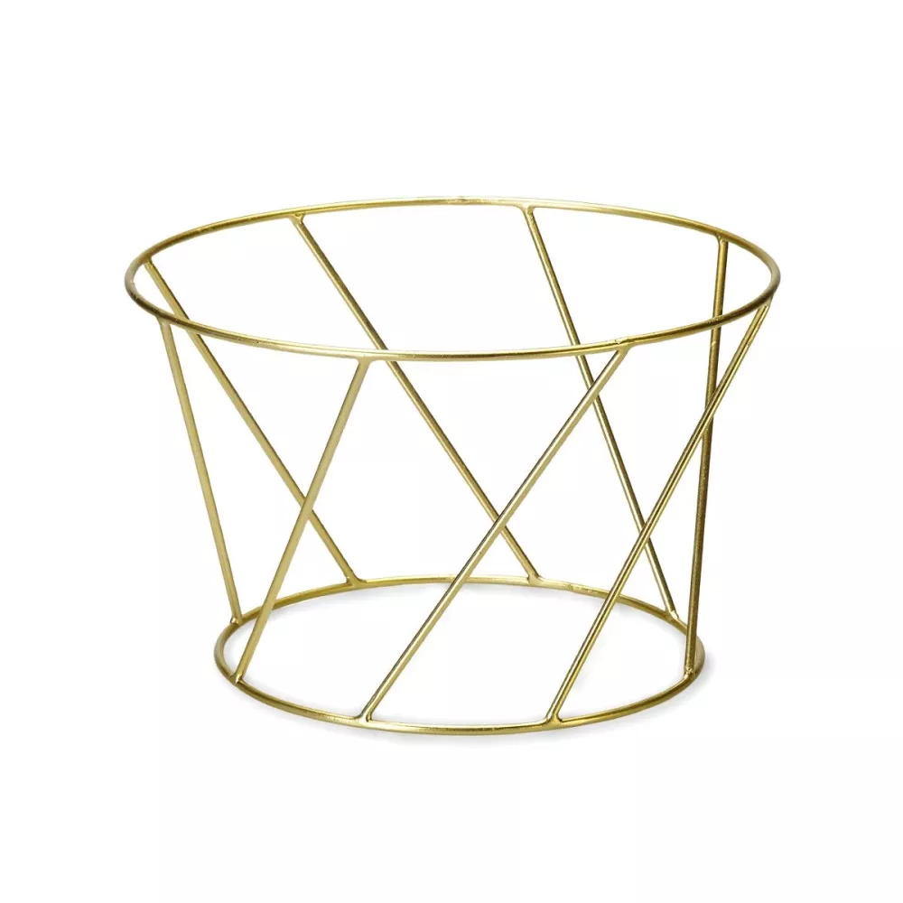 Alzatina in filo metallo intrecciato oro Non adatto per lavastoviglie Non adatto per microonde Materiale : Metallo Codice : FIL0021 Dimensionis: Ø 20/15 cm, H 12,5 cm