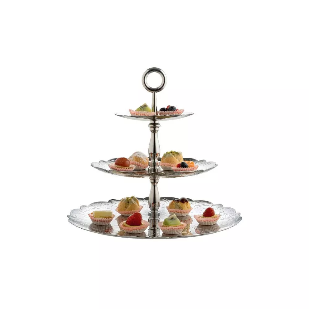ALESSI DRESSED FOR X-MAS Alzata a tre elementi in acciaio inossidabile 18/10 con decoro a rilievo. Codice: MW52/3 Diametro: 35 cm Altezza: 31cm