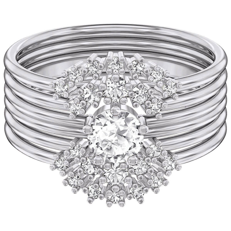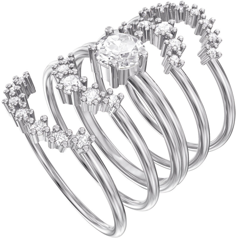 Questo anello a fasce di grande stile è decorato con gruppi di delicati cristalli bianchi con incastonatura a griffe, scintillanti come le stelle, e presenta un grande elemento di cristallo centrale. Un design moderno e versatile, puoi riordinare gli anelli come desideri per creare look differenti o indossarli su dita diverse. Colore: Bianco Materiale: Placcato color oro rosa / Rodio