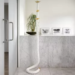 Lasciati avvolgere dall'eleganza e dalla praticità di Cima, l'innovativo appendiabiti a soffitto ideato da Lapo Ciatti. Questo pezzo unico è realizzato con corda nautica intrecciata di colore bianco, che non solo aggiunge una nota di freschezza, ma offre anche una resistenza affidabile. La corda diventa protagonista, trasformata in un complemento d'arredo accattivante grazie all'aggiunta di tre anelli con ganci in metallo, splendidamente rivestiti in oro 24 carati.