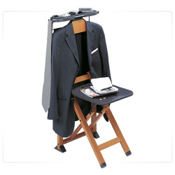 L'indossatore pieghevole in legno Suite di Foppapedretti include una comoda sedia con sedile anatomico, vaschetta porta oggetti, doppia staffa porta pantaloni, ganci per cinture e cravatte, spalla per giacche e camicie. La struttura è in legno massiccio di faggio verniciato color noce, con piedini antisdrucciolo in gomma. Quando è chiuso, occupa poco spazio e resta in piedi da solo.