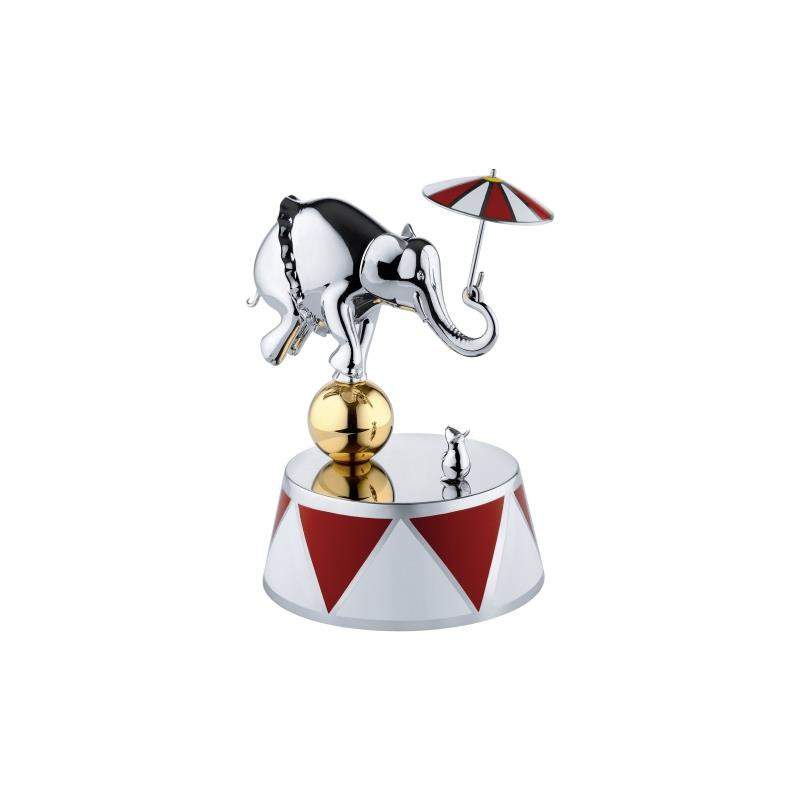 Alessi Carillon Ballerina Codice: MW37 Designer Marcel Wanders Carillon in acciaio inossidabile 18/10. Serie limitata a 999 pezzi numerati e 9 prove d'autore. Ballerina è un'elefantessa che ama la danza classica. Balla insieme al suo partner, un piccolo topo affascinato dal suo talento, volteggiando leggiadra su una palla dorata. Due romantici personaggi immaginati da Marcel Wanders per dare vita a un poetico carillon. La pedana sulla quale i due compiono il loro numero di danza racchiude il meccanismo che produce la melodia, per la quale Wanders ha scelto l'Entrata dei Gladiatori di Julius Fucík, il noto motivo che in tutto il mondo apre lo spettacolo circense. Larghezza (cm): 10.40 Altezza (cm): 16.00 Lunghezza (cm): 15.20