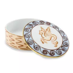 Una raffinata scatola portaoggetti in porcellana con decoro Terracotta e Sea Blue, arricchita da una filettatura in oro zecchino. Parte della collezione Il Viaggio di Nettuno, questa creazione firmata Luke Edward Hall reinterpreta la mitologia greco-romana con motivi marini e dettagli onirici. Sul coperchio spicca una creatura alata incorniciata da onde stilizzate, evocando il fascino del mondo mediterraneo antico. Perfetta per custodire piccoli oggetti, tè o gioielli, diventa anche un esclusivo centrotavola e un’idea regalo preziosa, presentata in luxury box Ginori 1735.