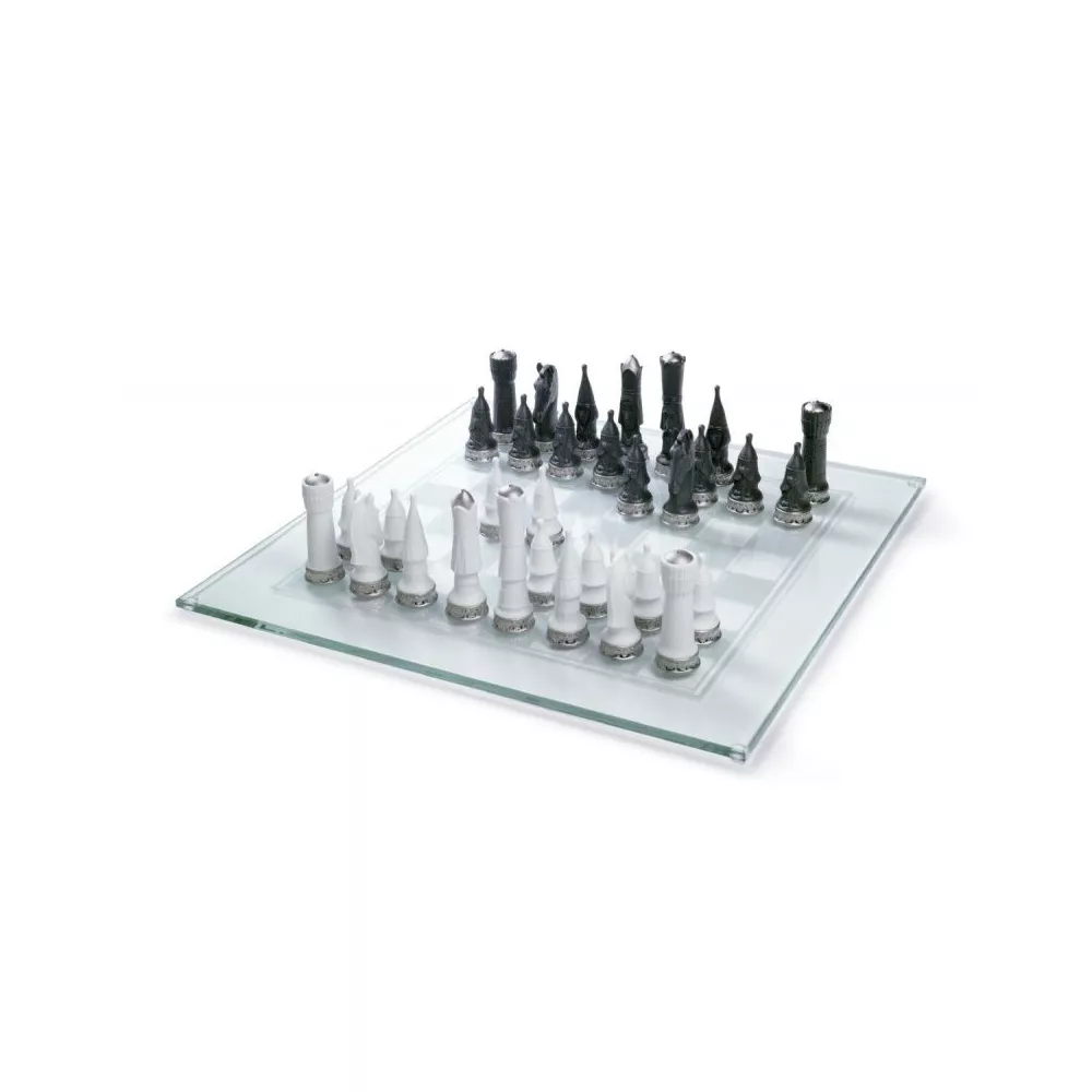 Remake del classico set di scacchi di Lladro (01006333 Medieval Chess Set), creato negli anni '80. L'ispirazione dei pezzi si riferisce allo stile medievale, come a ricordare le vere origini e i punti di partenza di questo gioco nel mondo occidentale. Porcellana bianca e nera, non smaltata; la squadra nera non è gres ma porcellana in un colore scuro. Lustro in platino con finitura lucida e opaca. La base dei pezzi è protetta da una copertura in feltro, per movimenti fluidi. La scacchiera è uno speciale vetro infrangibile con bordi levigati di 54 cm x 54 cm.