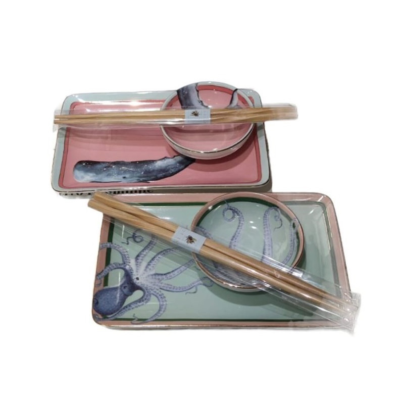 SET DI 2 VASSOI SUSHI CON COPPETTE, A22010014 - YVONNE ELLEN Il set sushi firmato Yvonne Ellen è composto da pregiata porcellana inglese e contiene due piatti da sushi, due ciotole per la salsa soia e due coppie di bacchette, il tutto disegnato con la presenza di una adorabile balena e un divertente polpo. Sku: A22010014
