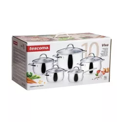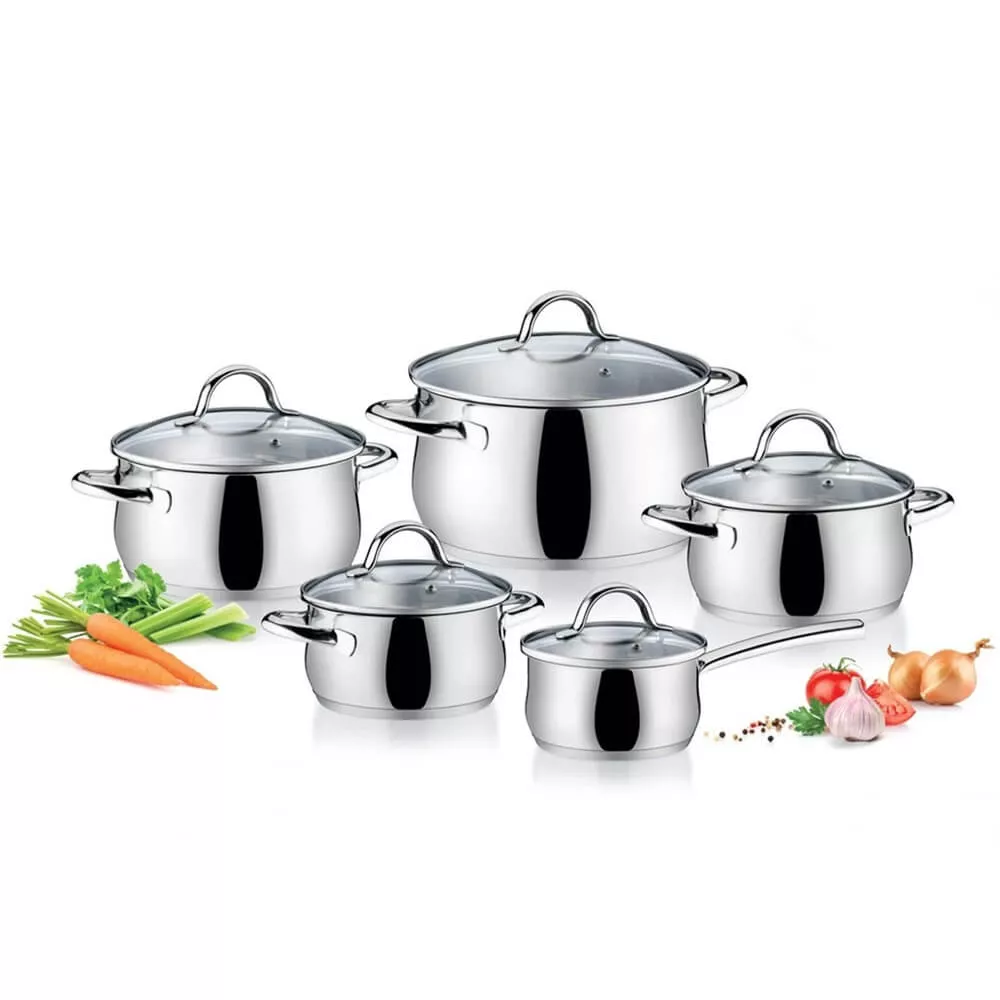 Set di pentole di alta qualità con coperchi in vetro e acciaio inox, solidi manici a tenuta d'acqua, fondo sandwich a triplo strato e scala graduata all'interno di ogni recipiente. Prodotte in acciaio inossidabile 18/10, sono adatte per tutti i tipi di piano cottura: gas, elettrico, vetroceramica e induzione. Lavabili in lavastoviglie.