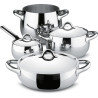 Batteria di pentole da 7 pezzi - SG100S7 Mami - Alessi Le pentole della collezione Mami, create da Stefano Giovannoni, sono un inno alla forme morbide e panciute degli utensili della tradizione italiana. Il set di pentole Mami in acciaio inossidabile 18/10 con finitura lucida è composto da : - Pentola alta inox cm 20 (SG100/20), - Casseruola alta a due manici inox cm 20 (SG101/20), - Casseruola bassa a due manici inox cm 24 (SG102/24), - Casseruola a manico lungo inox cm 14 (SG105/14), - Coperchio inox cm 14 (SG200/14), - Coperchio inox cm 20 (SG200/20), - Coperchio inox cm 24 (SG200/24). Codice: SG100S7