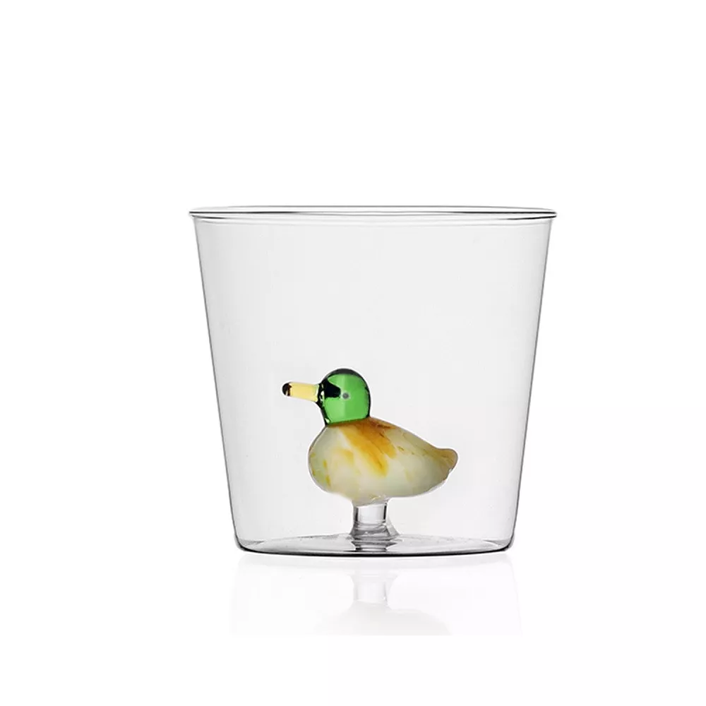Collezione Animal farm Design Alessandra Baldereschi Colore Clear Verde Bianco Materiale Borosilicato Manifattura Fatto a mano e modellato a lume Dimensioni H. 8 D. 8.5 capacità ml 350 Lavaggio Lavabile in lavastoviglie a basse temperature (consigliati 40°).