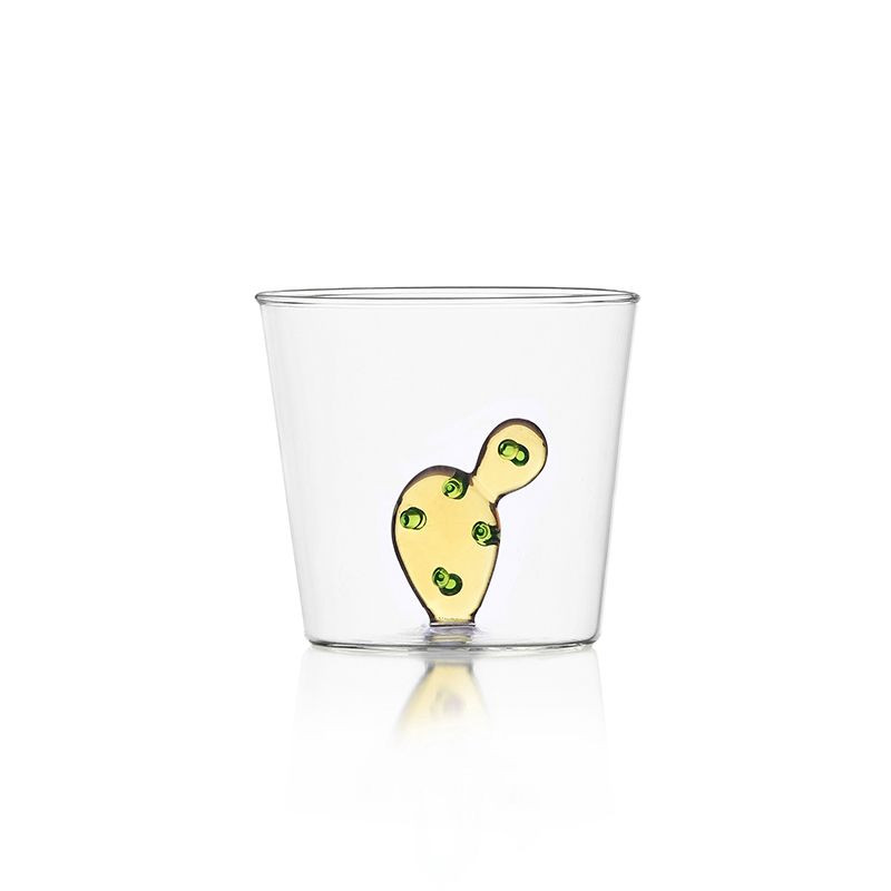 BICCHIERE CACTUS AMBRA, DESERT PLANTS, 09352109 - ICHENDORF MILANO La collezione Desert Plants è composta da elementi che richiamano la natura, con cactus colorati che creano un'immaginaria scenografia paesaggistica sul tavolo. Uno dei pezzi distintivi della collezione è un bicchiere con un cactus colorato all'interno del vetro, che aggiunge un tocco originale, leggero ed elegante al tavolo o anche come oggetto decorativo. Questo bicchiere in vetro soffiato artigianalmente è caratterizzato dalla sua perfetta trasparenza e realizzato con vetro borosilicato lavorato a lume a mano. Design by: Alessandra Baldereschi Vetro borosilicato lavorato a lume e realizzato a mano Dimensioni: 8,5 x H 8 cm Capacità: 300 ml Lavabile in lavastoviglie a basse temperature (consigliati 40°).
